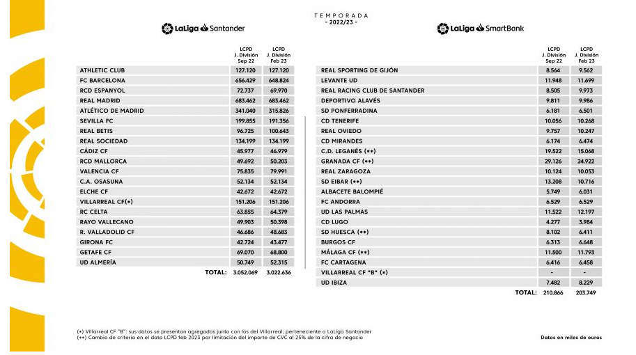 "Este límite de coste de plantilla es el importe máximo que cada club/SAD puede consumir durante la temporada 2022/2023 tras el mercado de verano, y que incluye el gasto en jugadores, primer entrenador, segundo entrenador y preparador físico del primer equipo (plantilla inscribible según el Artículo 38 de las Normas de Elaboración de Presupuestos).