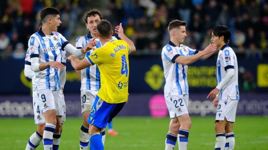 Más tímidas fueron las reclamaciones de la Real Sociedad en el minuto 12. También tras el saque de una falta, esta vez sobre el área cadista, Mikel Merino se quejó de un empujón, aunque al igual que en la acción anterior, el árbitro no vio nada punible y desde la sala VOR tampoco le indicaron lo contrario. Y es que, de existir, el contacto fue mínimo e insuficiente para hacer caer al centrocampista internacional.