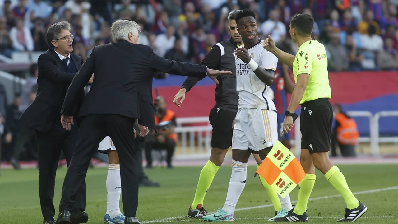 Un juez de línea y Ancelotti intentan que Vinicius abandone rápido el césped en el último Clásico.UES