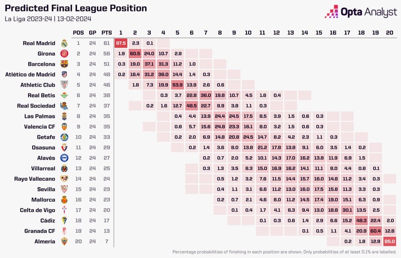 El modelo utilizado, explica la firma responsable, estima la probabilidad del resultado de cada partido (ganar, empatar o perder) utilizando cuotas del mercado de apuestas y Opta Power Rankings. Las probabilidades y clasificaciones se basan en actuaciones históricas y recientes del equipo. Además, se considera la fuerza de los oponentes utilizando estas probabilidades de resultado de los partidos y simula los partidos restantes de la competición miles de veces. Al analizar el resultado de cada una de estas simulaciones, el modelo puede ver con qué frecuencia los equipos terminaron en cada posición de la Liga para crear sus predicciones finales con un mayor índice de acierto.