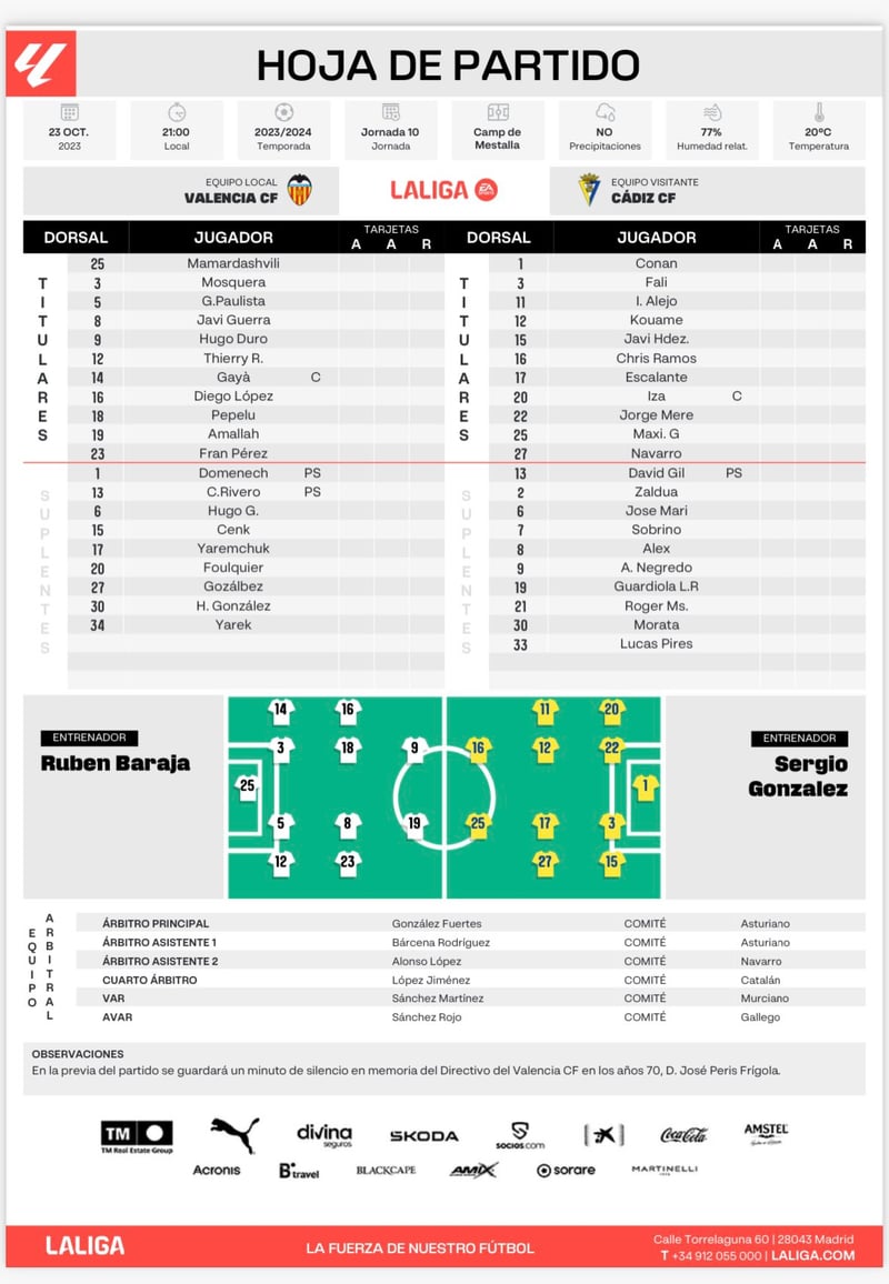 El Estadio de Mestalla acogerá el encuentro entre el Valencia y el Cádiz correspondiente a la jornada 10 de LaLiga EA Sports. Y lo hacen separados por sólo dos puntos en la clasificación. El equipo que entre Rubén Baraja es décimo (10º) con 11 puntos, mientras que los andaluces son decimoquintos (15º) con nueve. El partido estará dirigido por el colegiado Pablo González Fuertes y pondrá el broche a la jornada en Primera división.