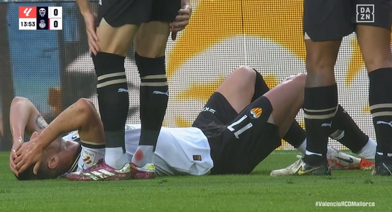 ¡Primer susto en Mestalla! Jaume Costa tendido en el césped. Se ha llevado un golpe muy duro en el cuello de Fran Pérez.