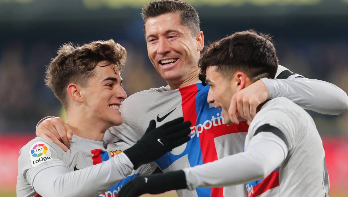 Lewandowski celebra el gol de Pedri junto con Gavi en La Cerámica.Twitter / LaLiga