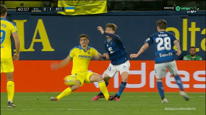 Amarilla ahora a Gerard Moreno por una falta sobre Miranda. Naranja por lo menos, dada la altura que tomó la entrada del delantero.