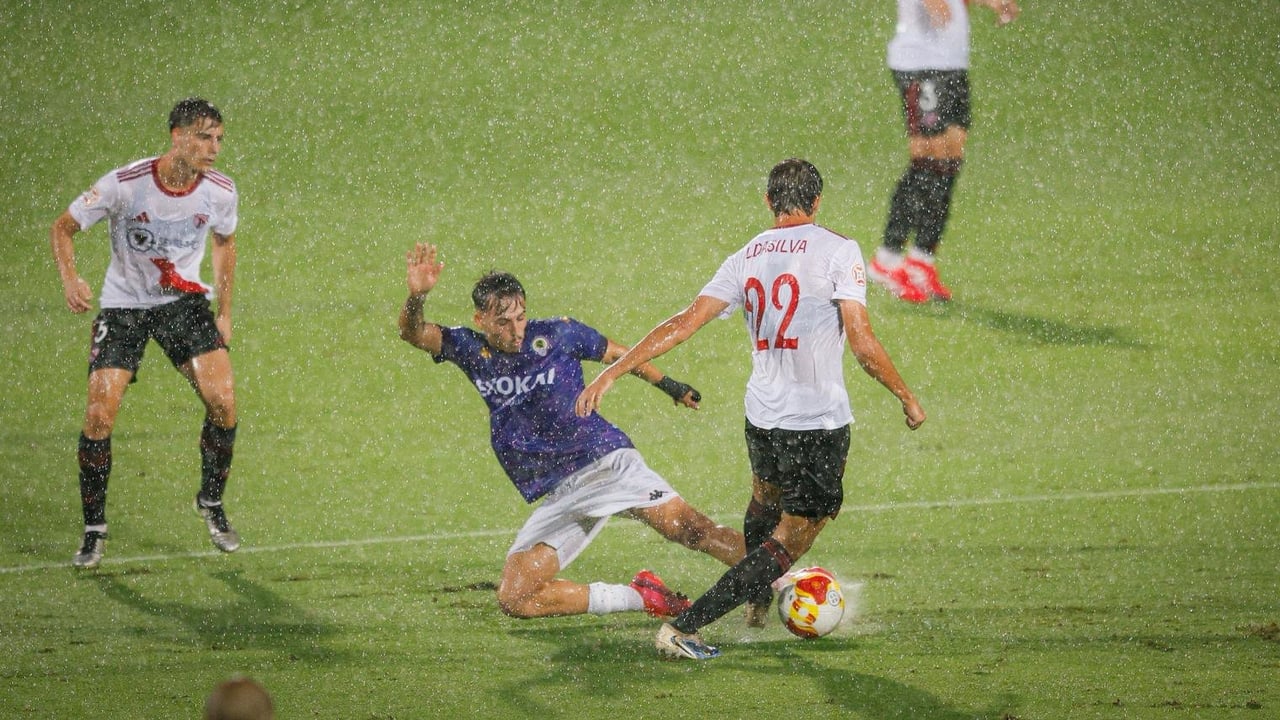Lulo Dasilva pugna con un rival alicantino en pleno aguacero.SFC
