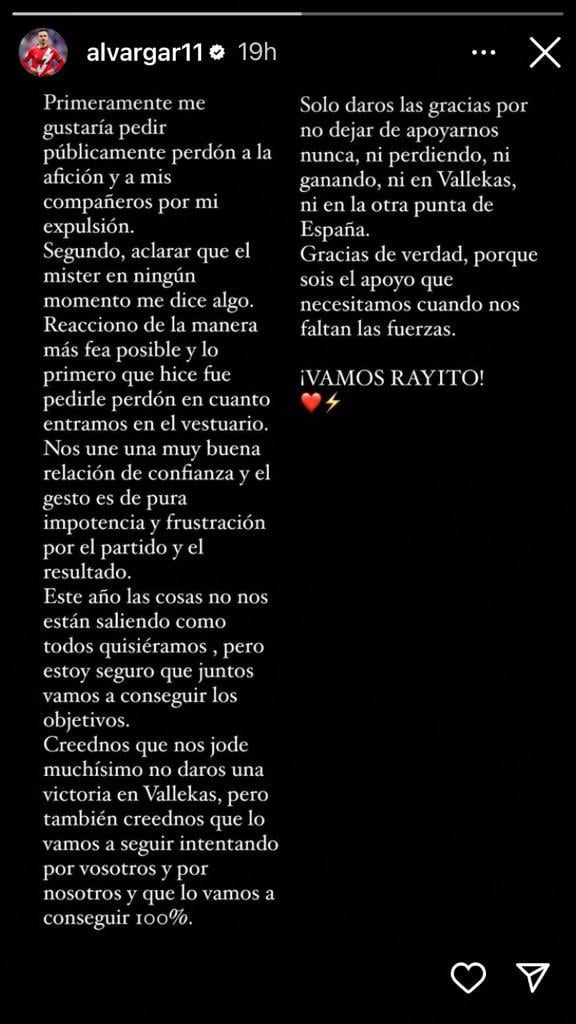 La derrota del Rayo Vallecano ante Las Palmas también demostró el momento de frustración que viven los madrileños, reflejado este en la expulsión del sevillano Álvaro García que vio 2 tarjetas amarillas en apenas 5 minutos para irse a la calle en el 81. Tan solo 2 minutos después llego el 0-2 de Javi Muñoz para Las Palmas. Precisamente a consecuencia de esa expulsión, el propio Álvaro García ha querido salir a dar la cara para pedir disculpas por lo sucedido este pasado sábado.
