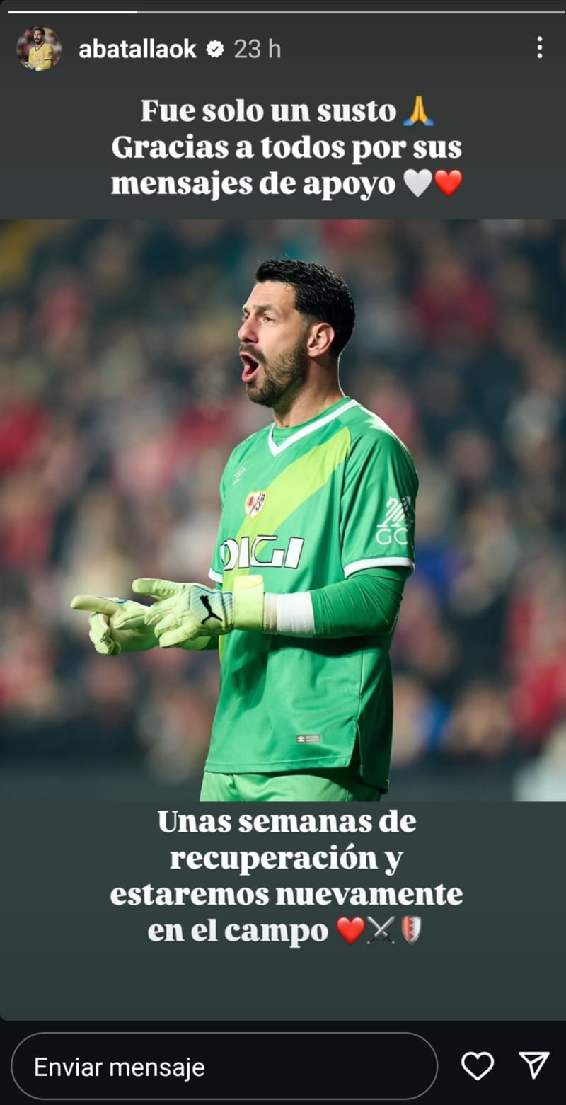 A través de una publicación en su cuenta de Instagram, Augusto Batalla informó que sufrió una lesión y estará fuera del equipo unas semanas para poder recuperarse, sin aportar más detalles: "Fue solo un susto. Gracias a todos por sus mensajes de apoyo. Unas semanas de recuperación y estaremos nuevamente en el campo", era lo que escribía el jugador rayista en dicha publicación. Tampoco el club ha comunicado de manera oficial cuáles son las dolencias del guardameta argentino ni el tiempo exacto que lo mantendrán fuera de los terrenos de juego. Según Mundo Deportivo, fue un golpe en su rodilla derecha lon que le hizo retirarse del entrenamiento del pasado martes.