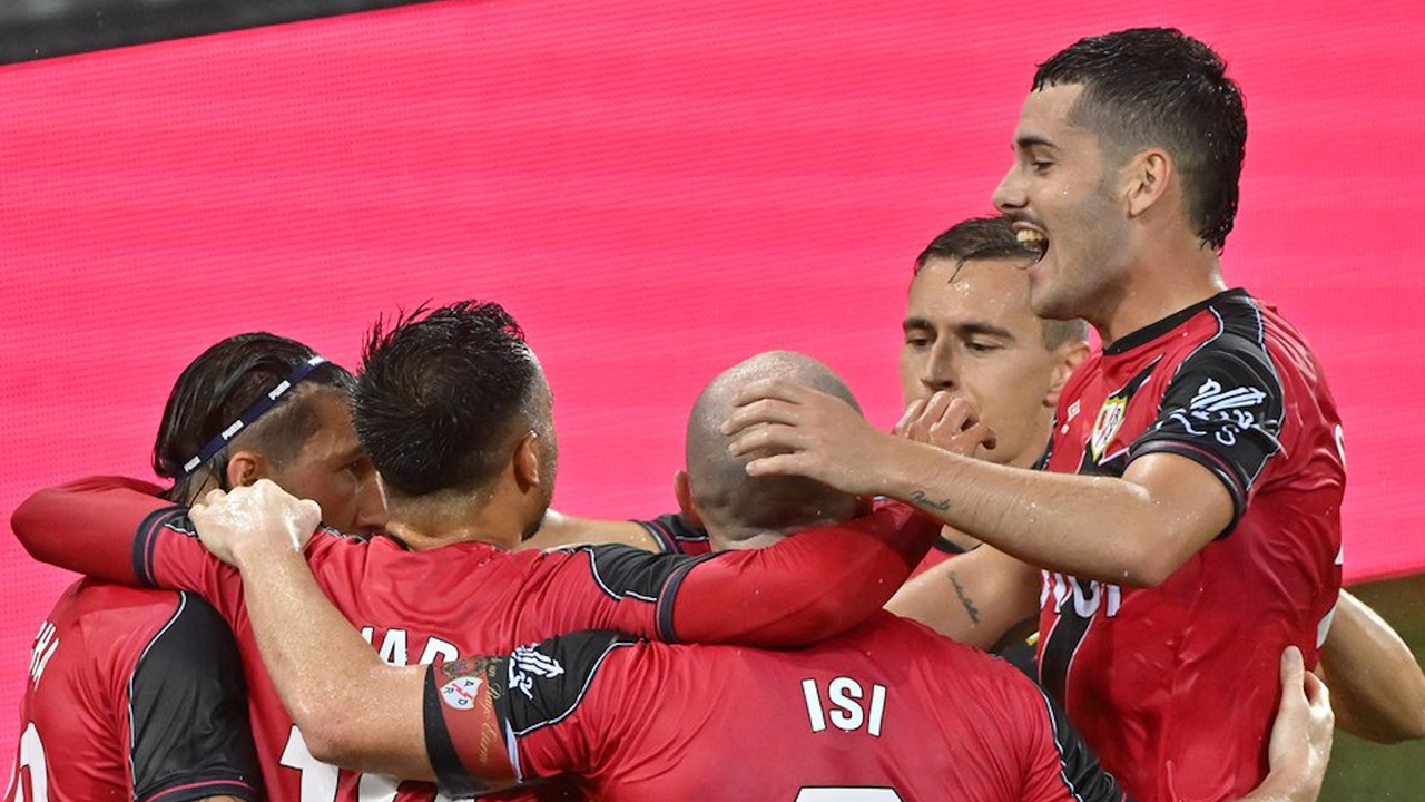 Los jugadores del Rayo celebran el gol ante el Neman Grodno@RayoVallecano