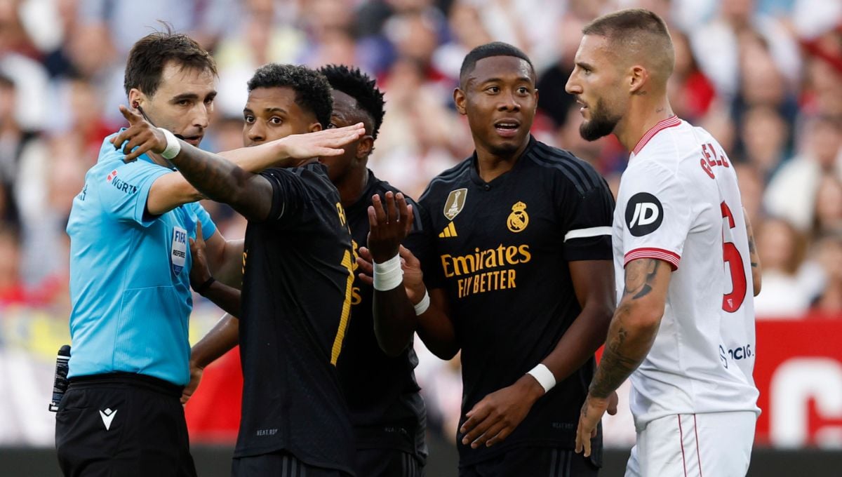La actuación de De Burgos Bengoetxea, árbitro del encuentro, ha dado para mucho. En el Sevilla se quejaron de una posible expulsión a Jude Bellingham por un pisotón con los tacos a Ivan Rakitic. Sin embargo, es el Real Madrid donde hay más quejas por los dos goles anulados en los primeros minutos y por un posible penalti sobre Vinicius.