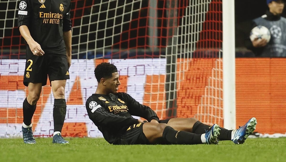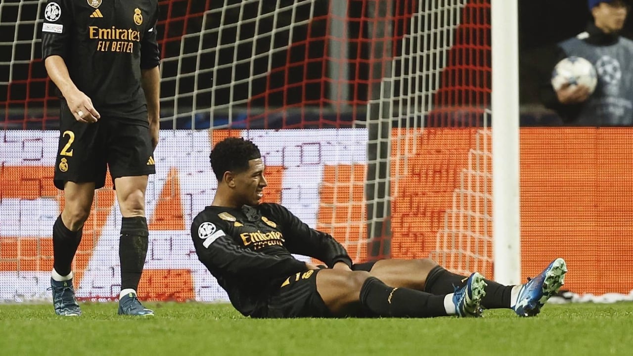 Jude Bellingham se duele en el suelo de unas molestias durante el partido disputado en Portugal frente al Braga.UES