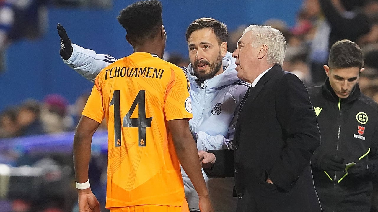 Carlo Ancelotti junto a su hijo Davide dando instrucciones a Tchouaméni en la bandaCordon Press