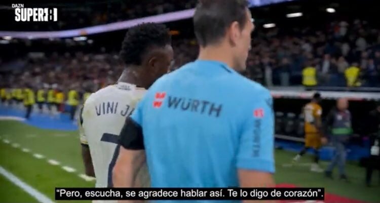 Cada jornada deja imágenes que dan de qué hablar, donde vemos a Vinicius protestar distintas jugadas al árbitro del partido concreto. DAZN pudo captar dicha conversación, donde se puede apreciar perfectamente lo que dicen ambos protagonistas. Sin embargo, más allá de lo normal, el jugador del Real Madrid se mostró tranquilo a la hora de debatir con el colegiado del encuentro, Martínez Munuera.