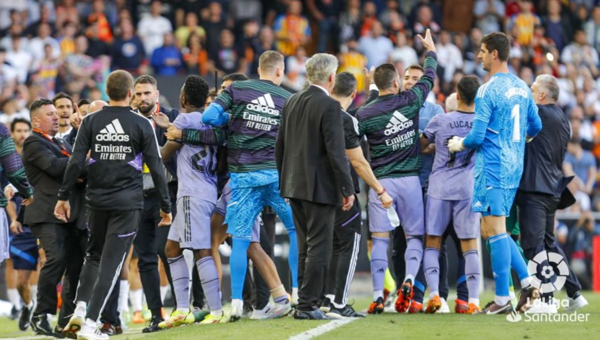 Fue en el minuto 75 cuando se detuvo el juego porque Vinicius Junior señaló directamente a la grada hacia un aficionado valencianista del que había recibido insultos racistas. En seguida el brasileño se fue hacia él y buscó el amparo de De Burgos Bengoetxea. El colegiado fue a avisar al delegado de campo del Valencia, David Rangel, para que avisase por megafonía lo ocurrido. El partido se detuvo durante más de diez minutos ya que el extremo del Real Madrid no conseguía tranquilizarse. Ni la charla de Carlo Ancelotti, ni sus compañeros Rüdiger y Militao, ni De Burgos Bengoetxea consiguieron tranquilizar al delantero.