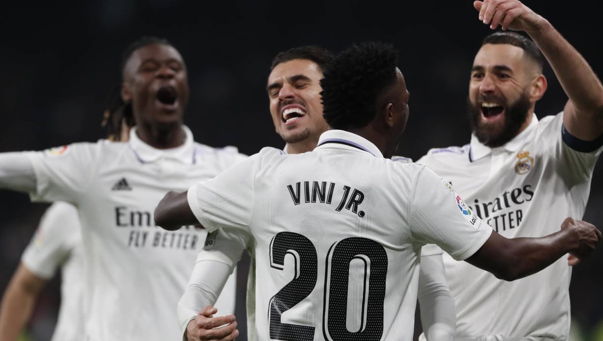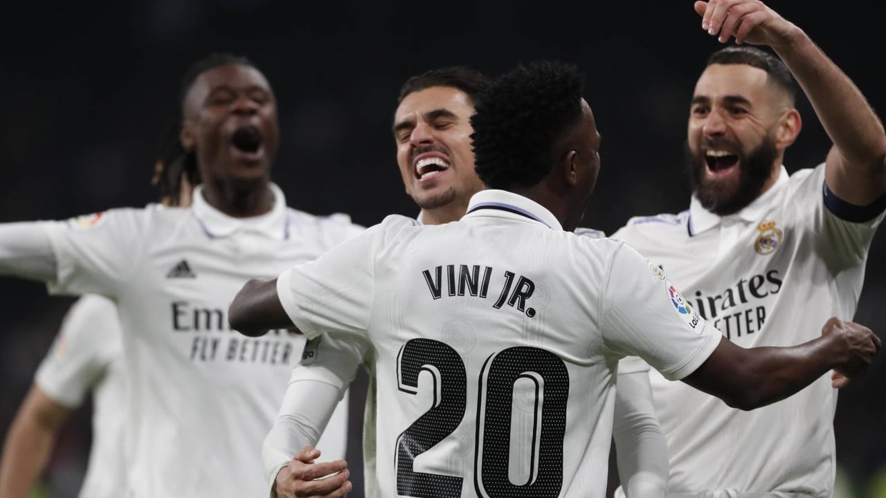 Dani Ceballos celebra un gol con Vinicius, Benzema y Camavinga.UES