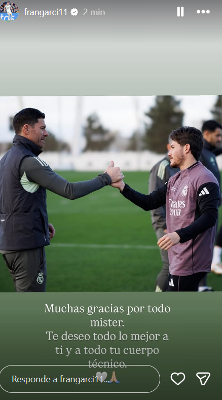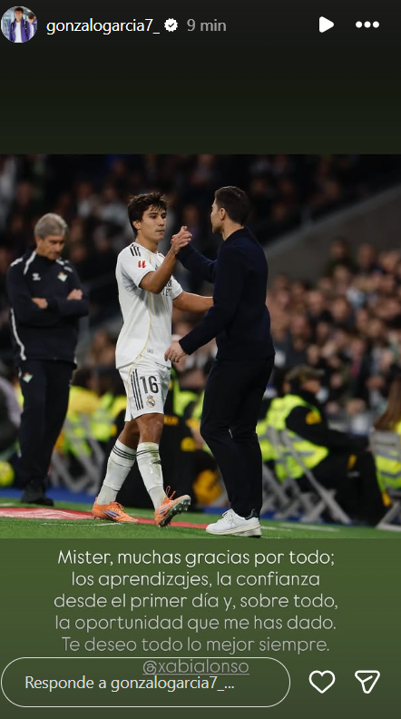 Gonzalo García se despide de Xabi Alonso: "Míster, muchas gracias por todo; los aprendizajes, la confianza desde el primer día y, sobre todo, la oportunidad que me has dado. Te deseo lo mejor siempre".
