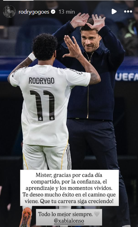 Rodrygo, que viene de firmar buenos partidos y reencontrarse con el gol, se despide de esta manera de Xabi Alonso: "Míster, gracias por cada día compartido, por la confianza, el aprendizaje y los momentos vividos. Te deseo mucho éxito en el camino que viene. Que tu carrera siga creciendo".