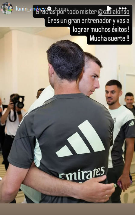 Lunin, que no ha podido tener el protagonismo que esperaba dado el gran rendimiento de Courtois ha querido despedirse de Xabi Alonso de la siguiente manera: "¡Gracias por todo míster. Eres un gran entrenador y vas a lograr muchos éxitos. Mucha suerte!"