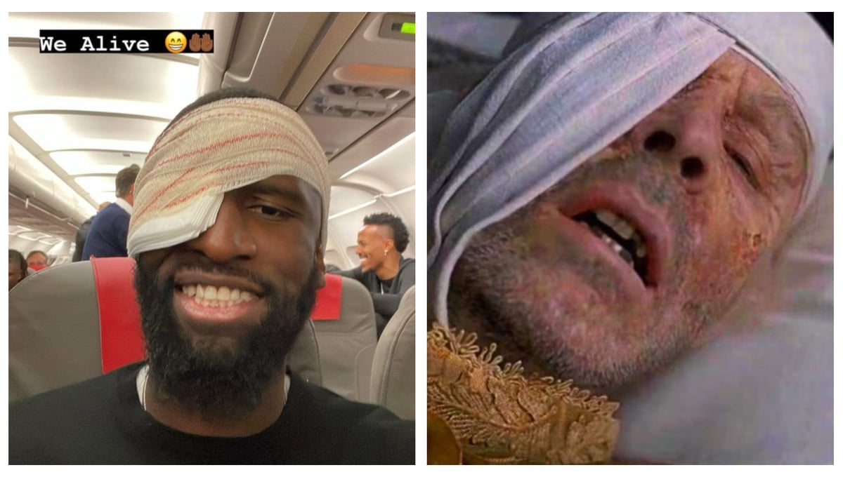 No fue la única foto que se vio de Antonio Rudiger en la noche de ayer, ya que transcendió otra del alemán, ya en el avión de vuelta a Madrid, se pudo ver al central del Real Madrid con un aparatoso vendaje que recordaba al que ha llevado Viserys Targaryen en el capítulo 8 de House of the Dragon (La Casa del Dragón en España), aclamada serie que se ha estrenado en HBO Max y que es una precuela de la famosa Juego de Tronos.