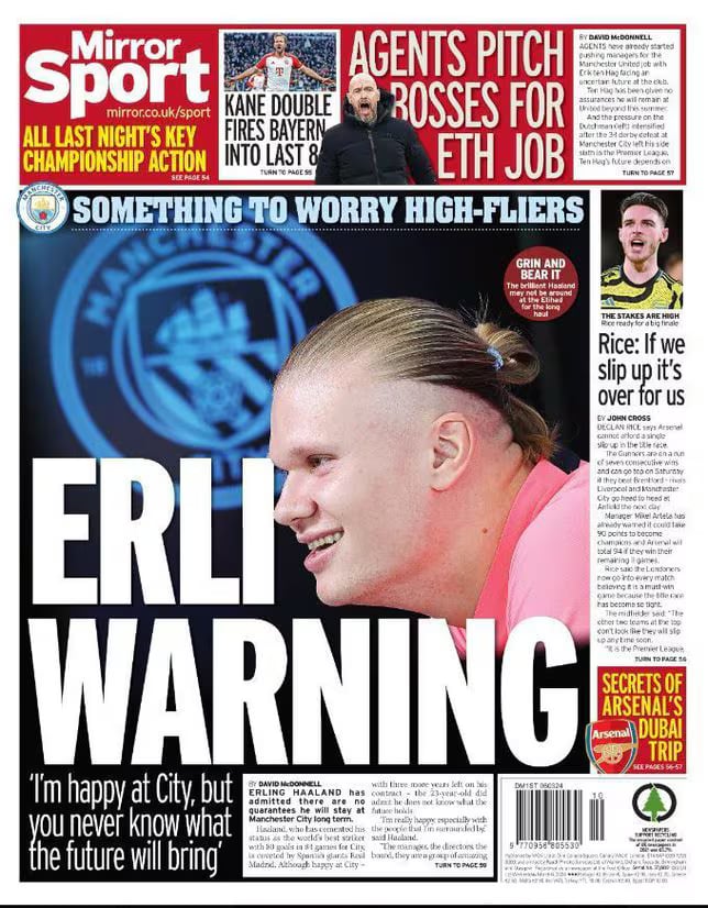 The Sun, por su parte, explica: “Coqueteo de Haaland con el Madrid. Haala Madrid”. Telegraph: “Haaland abre la opción de cambiarse al Madrid”. Daily Express, por su parte, resalta que “Haaland le abre las puertas al Madrid” y que “no asegura seguir mucho tiempo en el City, a pesar de estar contento”.