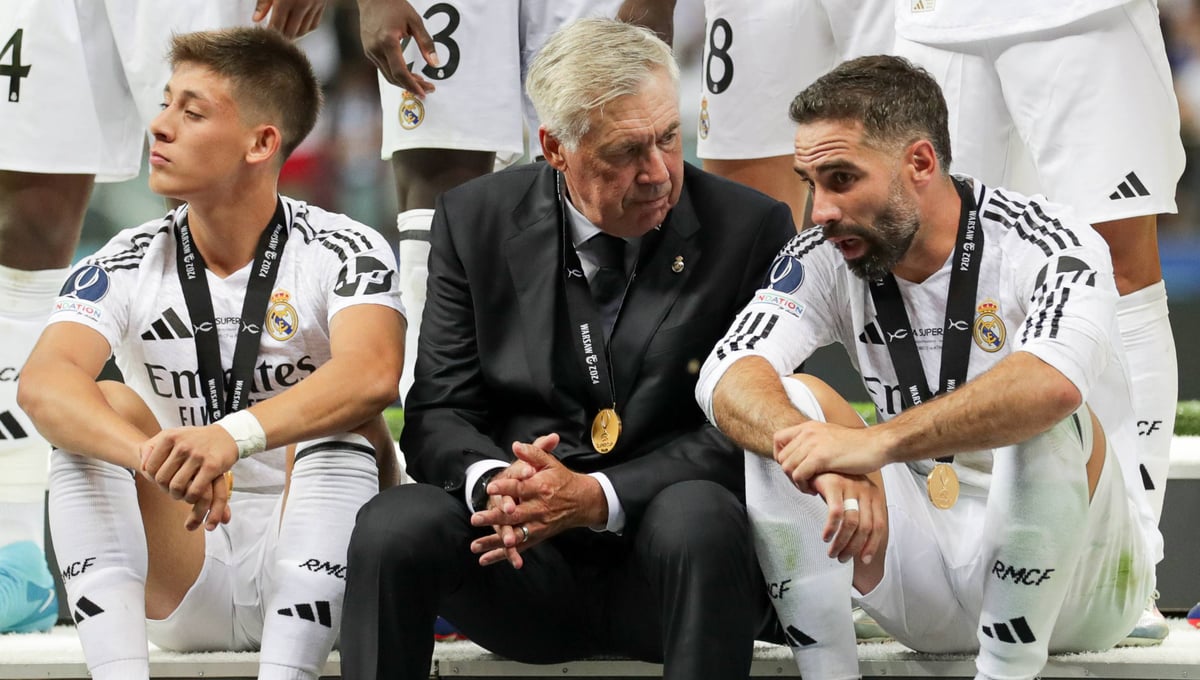 Güler, junto a Ancelotti y Carvajal, tras ganar la Supercopa de Europa 2024Cordon Press