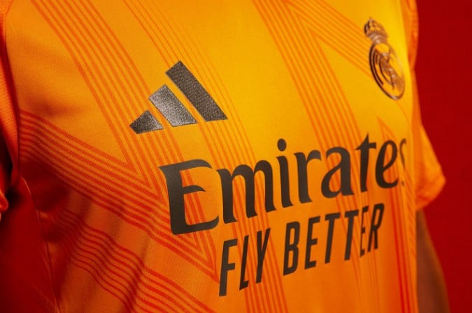 El Real Madrid y Adidas han dado a conocer la segunda equipación para la temporada 2024-25. Es de color naranja y cuenta con un gráfico abstracto y astral que aparece a través de una tonalidad más intensa en la camiseta. Los detalles del cuello, el logotipo de Adidas, el escudo del club, los patrocinadores y las tres franjas de los hombros son del color del cielo nocturno, mediante diferentes tonos de azul.