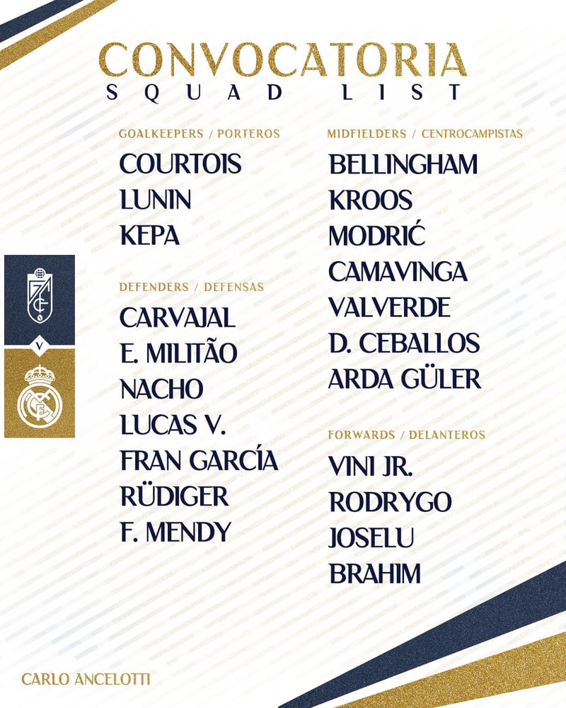 El técnico del Real Madrid confirmó que hay jugadores que necesitan descanso (Vinicius, Bellingham, Kroos, Rodrygo, Valverde, Rüdiger...) y otros muchos necesitan tener minutos porque lo merecen tras jugar poco esta temporada o porque vuelven de lesión y buscan ganar ritmo: "Tenemos que hacer un montón de cosas. Mañana tenemos que jugar un partido, respetar al rival como el Granada CF, a la competición, a nosotros... Tenemos partidos antes de la final que nos van a ayudar a prepararla bien. Obviamente, haré rotaciones. Todos van a jugar en este periodo para llegar a tope. Necesitamos descansar también, porque ha sido una temporada muy exigente. Entonces, voy a dar algunos días de descanso después de los partidos y, obviamente, después del partido, celebrarlo".