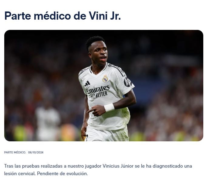 "Está bloqueado. Ha tenido un problema en la zona cervical, está dolorido y mañana le harán pruebas", anunciaba de manera escueta el técnico Carlo Ancelotti en una lúgubre rueda de prensa. A primera hora de este domingo, los servicios médicos del Real Madrid han emitido un comunicado en el que confirman el problema. "Tras las pruebas realizadas a nuestro jugador Vinícius Júnior se le ha diagnosticado una lesión cervical. El jugador se encuentra pendiente de evolución", reza en la nota de los galenos, quienes han desaconsejado al atacante que se someta al largo desplazamiento de 12 horas de avión para unirse a la selección de Brasil.