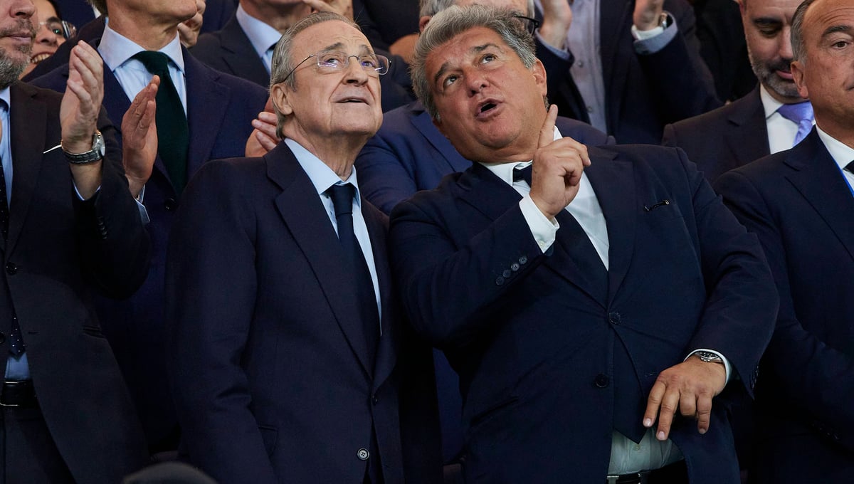 Florentino Pérez y Joan Laporta dialogan sobre los nuevos avances tecnológicos en el Santiago Bernabéu. Cordon Press