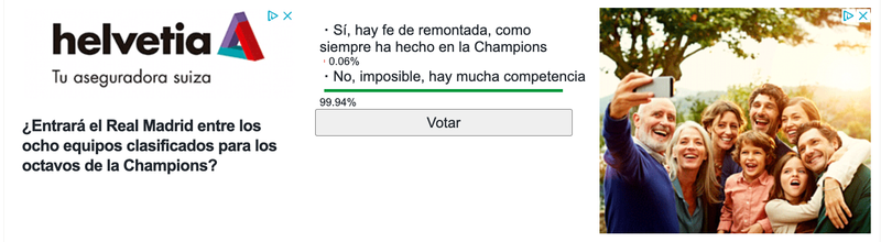 Por ello, hemos querido conocer la opinión de la afición mediante la Encuesta Helvetia de ESTADIO Deportivo. Hacía tiempo que no veíamos una respuesta tan sólida, comparando ambas opciones. Prácticamente el cien por cien creen que el Real Madrid no se clasificará entre los ocho primeros debido a la gran competencia que hay en la Champions League esta temporada.