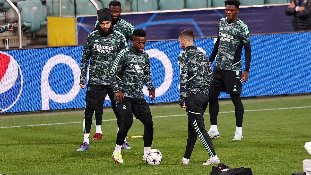 La plantilla del Real Madrid saltó al campo principal de entrenamiento de la ciudad deportiva de Valdebebas con veinte minutos de retraso al horario previsto y sin Courtois. Las sensaciones del portero belga no han mejorado y Carlo Ancelotti descartó que se probase en la dinámica de grupo.