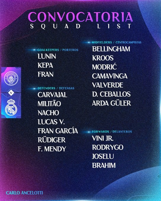 La lista de convocados del Real Madrid para el encuentro de vuelta de cuartos de final de la Liga de Campeones la integran: los porteros Andry Lunin, Kepa Arrizabalaga y Fran González; los defensas Dani Carvajal, Lucas Vázquez, Éder Militao, Nacho Fernández, Antonio Rüdiger, Fran García y Ferland Mendy; los centrocampistas Aurélien Tchouaméni, Eduardo Camavinga, Toni Kroos, Dani Ceballos, Luka Modric, Fede Valverde, Arda Güler y Jude Bellingham; y los delanteros Vinicius Junior, Rodrygo Goes, Brahim Díaz, Joselu Mato.