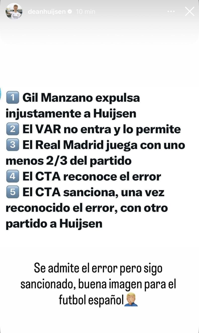 El joven central del Real Madrid, Dean Huijsen, no escondió su indignación en redes sociales después de que se confirmara que su sanción por la tarjeta roja vista en Anoeta se mantiene firme, a pesar de que el propio Comité Técnico de Árbitros (CTA) reconoció que la decisión de Gil Manzano fue equivocada, mediante un vídeo en su programa ‘Tiempo de Revisión’.