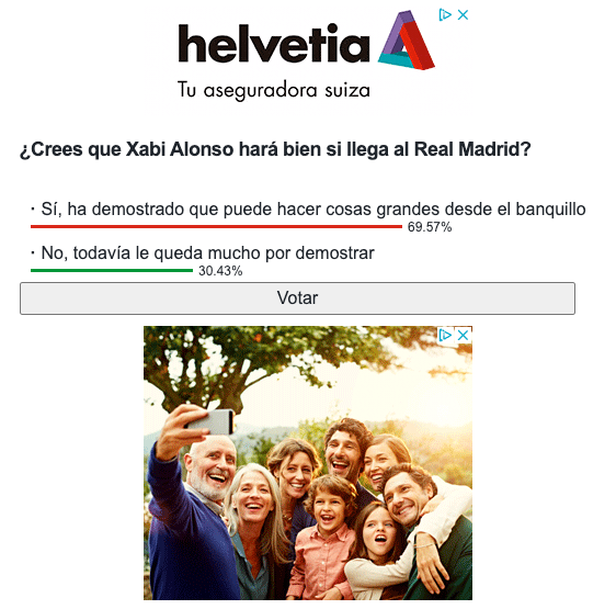 Por eso, a través de la Encuesta Helvetia de hoy en ESTADIO Deportivo hemos querido saber la opinión de la afición sobre si Xabi Alonso hará bien si llega al Real Madrid. Su carrera en los banquillos ha sido corta: comenzó dirigiendo al Sanse, filial de la Real Sociedad, con el que llegó a ascender a Segunda división; después firmó por el Bayer Leverkusen; y ahora daría un salto mayúsculo, quizás el más grande que pueda dar en su carrera, para dirigir al Real Madrid.