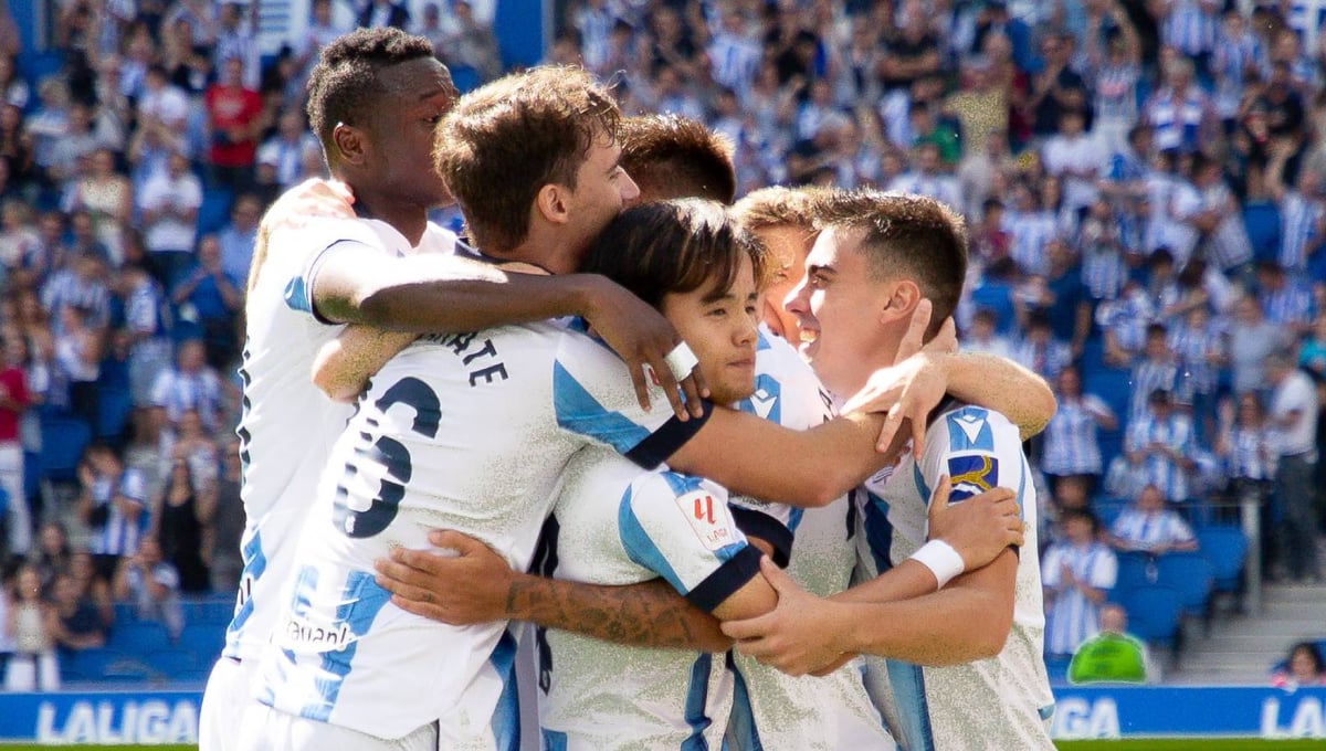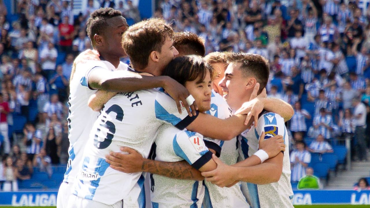 Los jugadores de la Real Sociedad, apiñados celebrando un gol.X / Real Sociedad