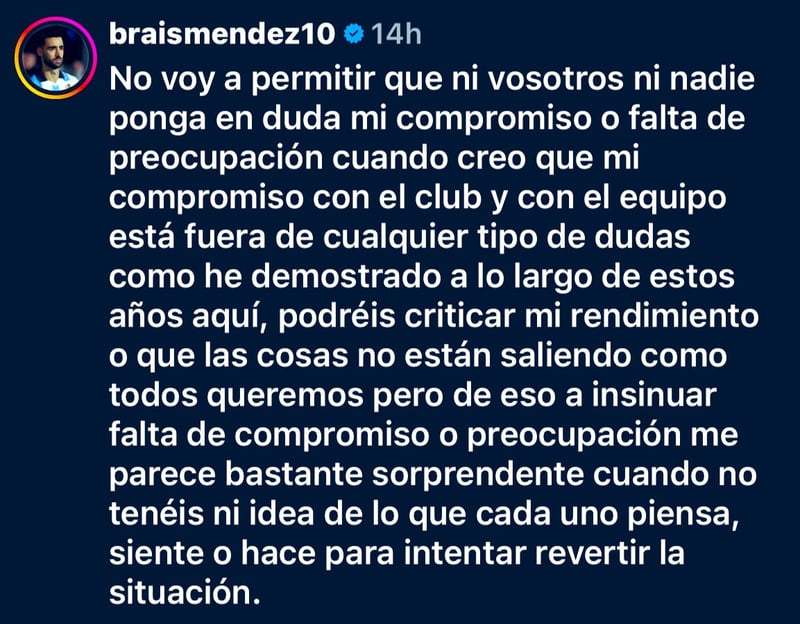 El mediocentro de Mos ha recibido multitud de críticas en redes sociales durante todos estos meses no tanto por su rendimiento sino por su compromiso hacia el club y ha sido ahora cuando parece que no ha podido más y ha explotado en sus redes sociales. "No voy a permitir que ni vosotros ni nadie ponga en duda mi compromiso o falta de preocupación cuando creo que mi compromiso con el club y con el equipo está fuera de cualquier tipo de dudas como he demostrado a lo largo de estos años aquí", ha escrito.