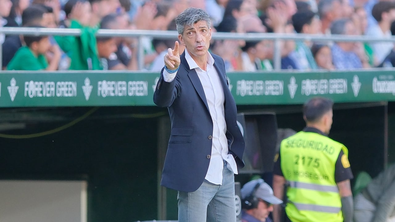 El míster donostiarra realiza una indicación durante el partido en La Palmera.Lince