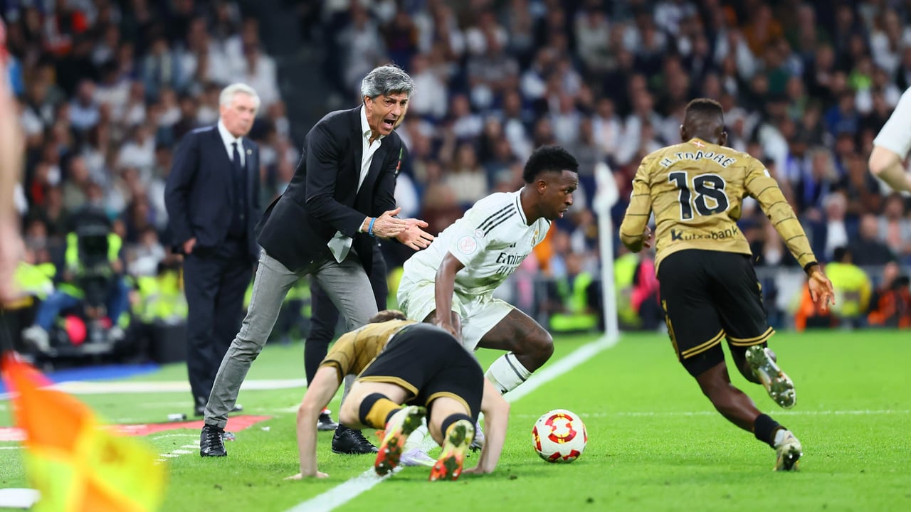 No se cortaba Imanol Alguacil anoche tras la dura eliminación de la Real Sociedad frente al Real Madrid en la prórroga del partido de vuelta de semifinales de la Copa del Rey. El técnico txuri urdin ponía el foco en la polémica jugada del fuera de juego de Kylian Mbappé que acabó provocando el saque de esquina de uno de los goles blancos pero también hablaba de los suyos, especialmente de la entrega de sus jugadores.