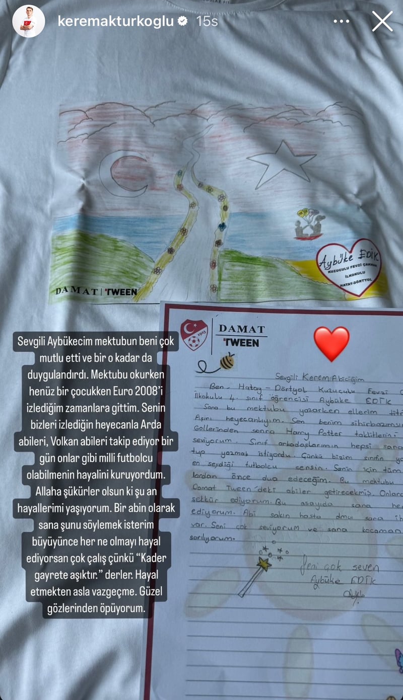 Aktürcoglu ha sido noticia también en su país por una bonita respuesta que ha ofrecido a un joven fan que le escribió para decirle que era una fuente de inspiración para él. "Querido Aybüke, tu carta me hizo muy feliz y me emocionó. Mientras la leía, volví a la época en la que veía la Eurocopa 2008 cuando era niño. Seguía a los hermanos Arda y Volkan con la misma emoción que tú. Yo soñaba con ser algún día un jugador de la selección nacional, como ellos. Gracias a Dios, ahora estoy viviendo mis sueños. Como tu hermano mayor, me gustaría decirte que sea lo que sea que sueñes ser cuando seas mayor, trabaja duro porque, como se suele decir, 'El destino ama el esfuerzo'. Nunca dejes de soñar".