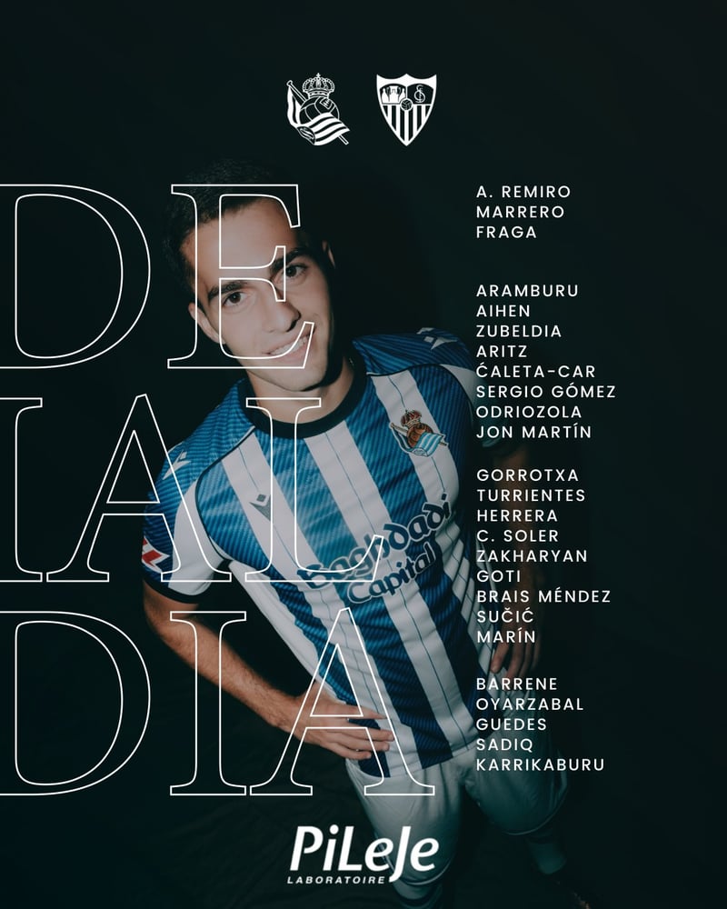 De esta forma, los 25 hombres que el técnico irundarra ha citado para el choque en Anoeta frente al Sevilla son: Álex Remiro, Marrera, Fraga, Aramburu, Aihen, Zubeldia, Aritz, Caleta-Car, Sergio Gómez, Odriozola, Jon Martín, Gorrotxategi, Turrientes, Yangel Herrera, Carlos Soler, Zakharyan, Goti, Brais Méndes, Sucic, Pablo Marín, Barrenetxea, Oyarzabal, Guedes, Sadiq y Karrikaburu.