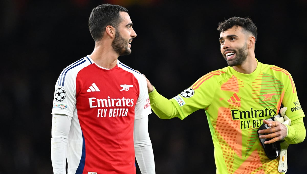 David Raya felicita a Mikel Merino tras su debut con el Arsenal.Arsenal FC