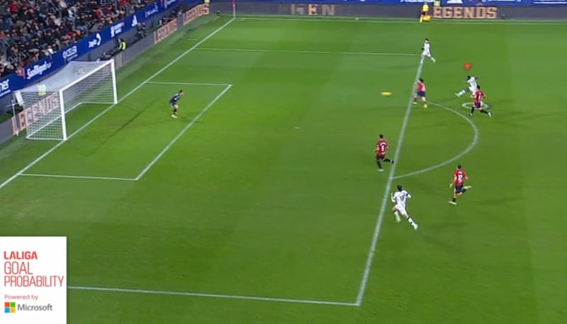 Ante Osasuna arrancó también casi en la línea divisoria en una posición algo dudosa y en la que se llegaron a trazar las líneas en la sala VAR. Y con la defensa rojilla en pleno repliegue intensivo, Sadiq miró el marco de Sergio Herrera y echó a correr. Y cuando ya pisaba la media luna del área navarra, volvió a lanzar un misil teledirigido a la escuadra e imposible de detener por la violencia y la colocación con la que iba.