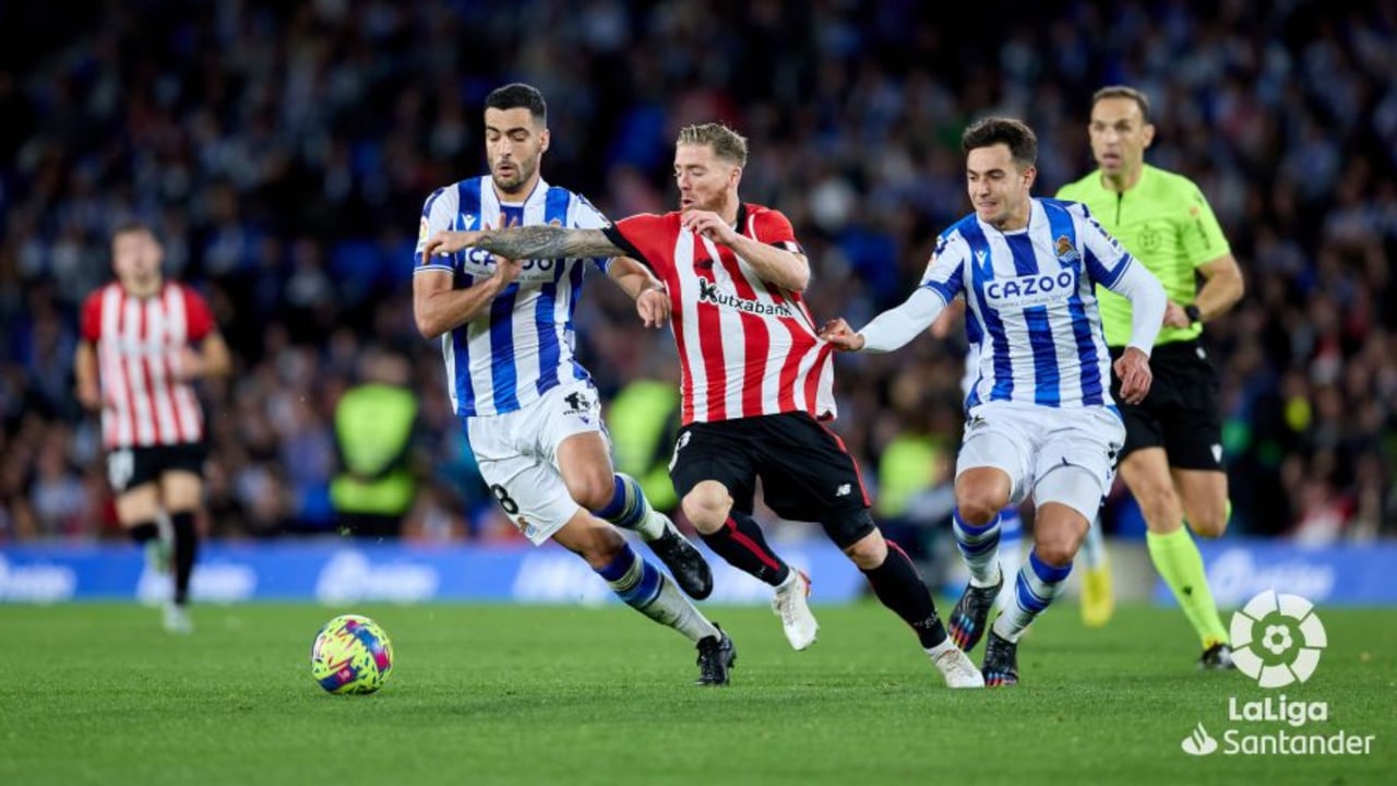 Merino, Muniain y Zubimendi peleando por un balón en el derbi vascoLaLiga