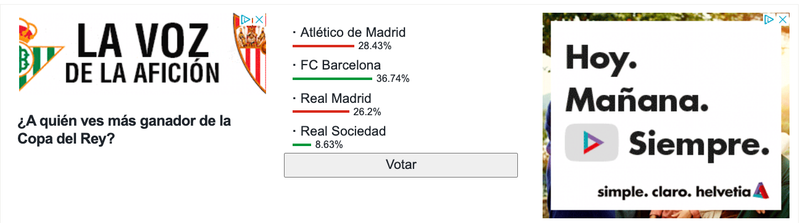 Al menos así lo demuestran los votantes de la Encuesta Helvetia de hoy en ESTADIO Deportivo. Tras conocerse en el día de ayer del pase de Real Sociedad y FC Barcelona como los últimos clasificados para las semifinales de la Copa del Rey, había que preguntar qué equipo de los cuatro podría partir como favoritos. Sin embargo, hemos querido fijarnos en el equipo al que tienen menos fe.