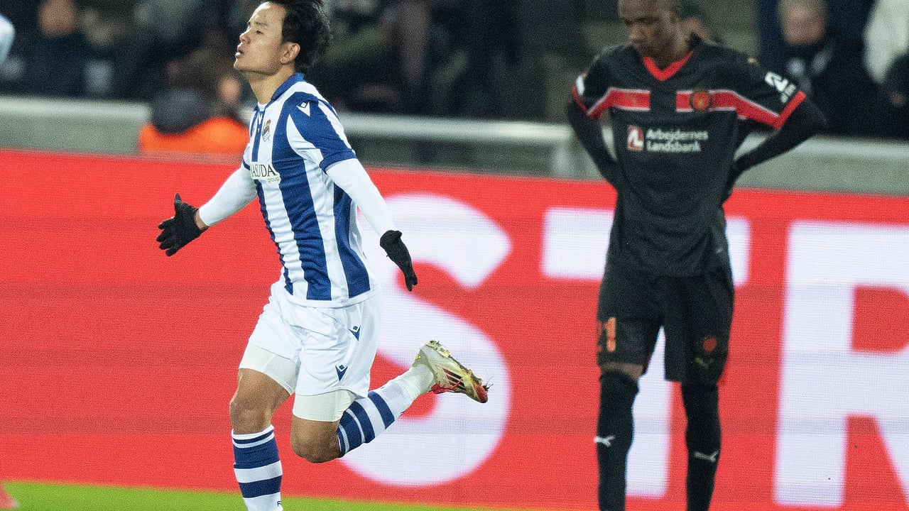 Takefusa Kubo fue el protagonista de la victoria de la Real Sociedad ante el Midtjylland gracias a su obra arte en el 0-2 'txuri urdin'. El atacante japonés demostró su velocidad y conducción de balón en la frontal del área para perfilarse y sacar con su pierna izquierda un disparo directo a la escuadra de la portería danesa que dejó boquiabiertos a propios y extraños. No en vano, el nipón fue elegido MVP del partido y por eso mismo fue el futbolista más solicitado en la zona mixta.