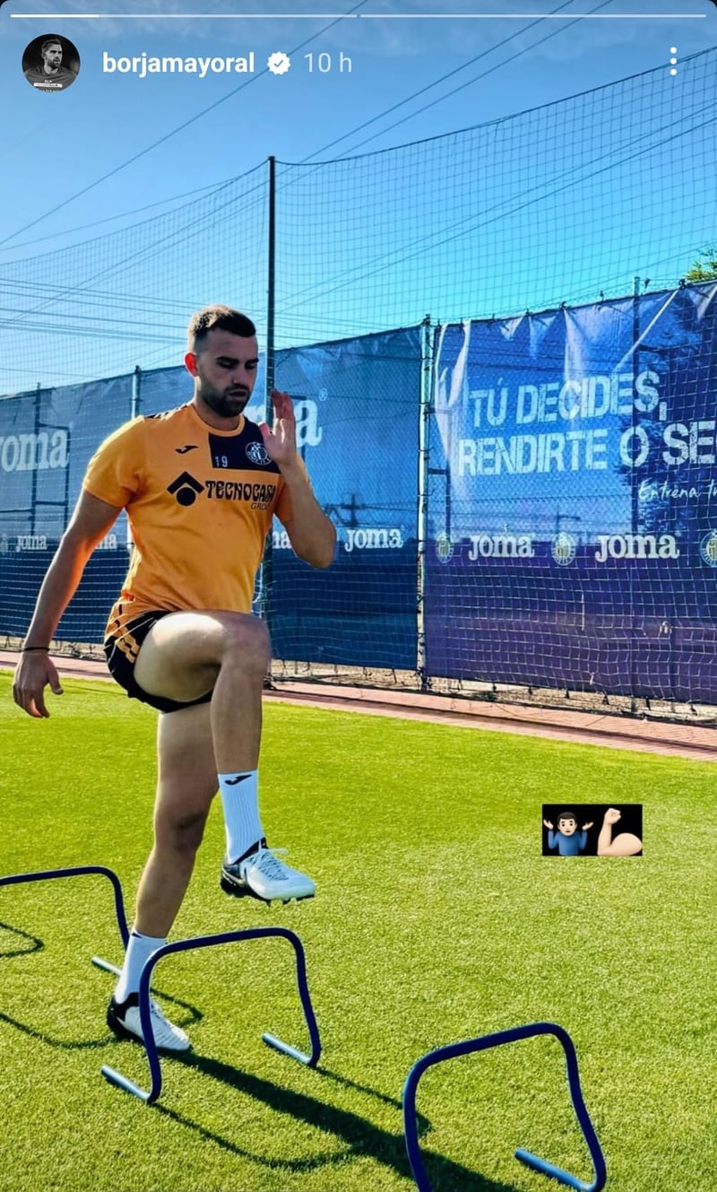 Ante todo este ruido, Borja Mayoral ha optado por aquello de 'a buen entendedor pocas palabras bastan'. En plena ebullición de rumores sobre sus posibles destinos, cada vez más rocambolescos, el madrileño ha compartido a través de sus 'stories' en Instagram una fotografía en la que se le ve vestido con la ropa de entrenamiento del Getafe CF, plenamente compretido con su recuperación y ejercitándose tranquilamente. Además, para mayor énfasis dentro de su discrección, ha tuneado la imagen con dos emoticonos, uno de incomprensión y otro de fuerza. La lectura que invita a hacer es que no sabe nada de traspasos y que sólo piensa en cumplir su promesa de volver más fuerte de su lesión.