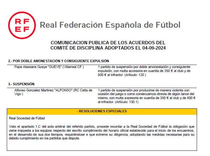 Este miércoles, el Comité de Disciplina de la RFEF ha dado a conocer las sanciones de la próxima jornada y, en el apartado de resoluciones especiales, hace mención a la entidad donostiarra. "Visto el apartado 1.C del acta arbitral del referido partido, procede recordar a la Real Sociedad de Fútbol la obligación que viene impuesta a los equipos respecto del escrito cumplimiento del horario oficial establecido para el inicio de los encuentros, en el desarrollo de sus dos tiempos, requiriéndose e que extreme su diligencia, adoptando las medidas necesarias para su debido cumplimiento en los partidos que dispute".