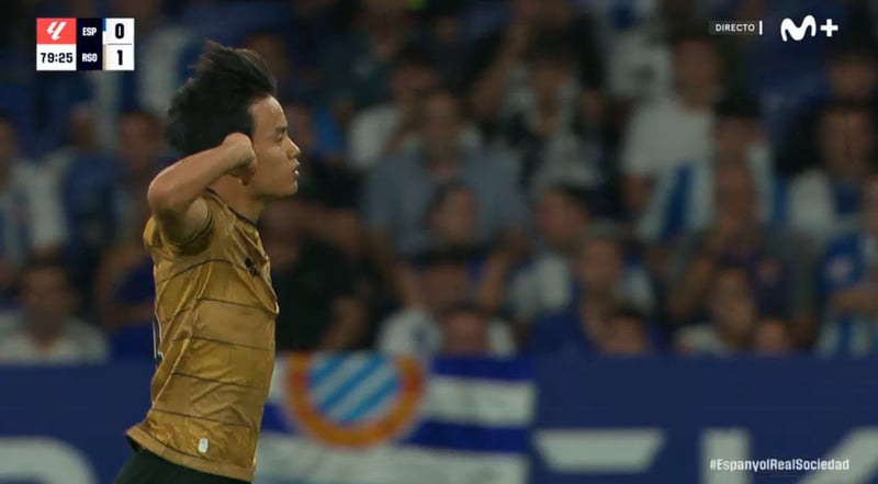 El japonés fue protagonista por el golazo que dio los tres puntos a la Real Sociedad y por la celebración, con rostro muy serio y gestos reivindicativos después de haber comenzado como suplente el partido ante el RCD Espanyol