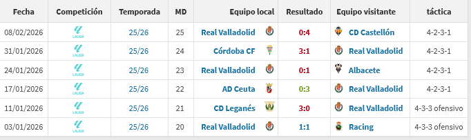 Después de seis jornadas de Luis García Tevenet al frente del Real Valladolid, los de Pucela solo han sumado cuatro puntos de 18 posibles gracias a un triunfo (jornada 22 por 0-3 ante el Ceuta) y un empate (jornada 20 ante el Racing de Santander). Con estos números y con el resquemor aún de la derrota de este pasado domingo ante el Castellón por un claro 0-4, el Real Valladolid se ha quedado al borde de los puestos de descenso con 28 puntos y a solo uno del Huesca que marca las posiciones que nadie quiere en Segunda división.