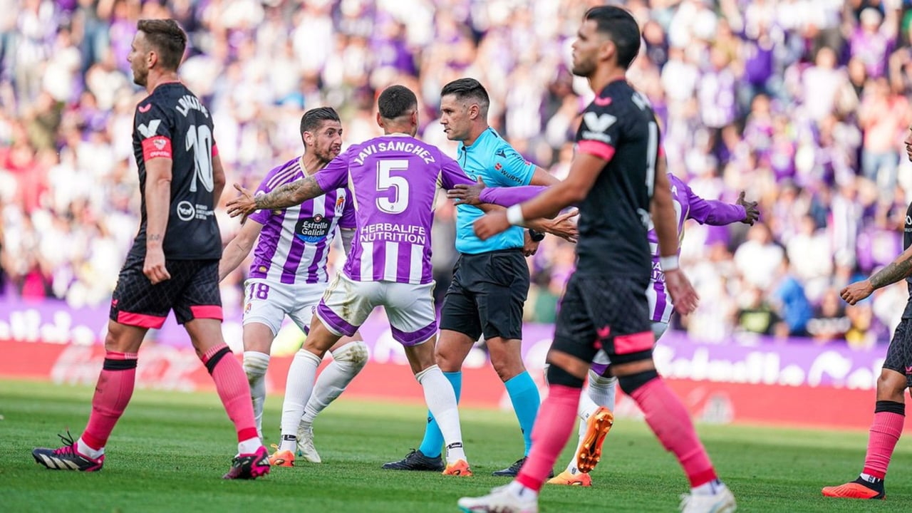 Jugadores del Real Valladolid protestan al árbitro durante el partido ante el Sevilla FCReal Valladolid