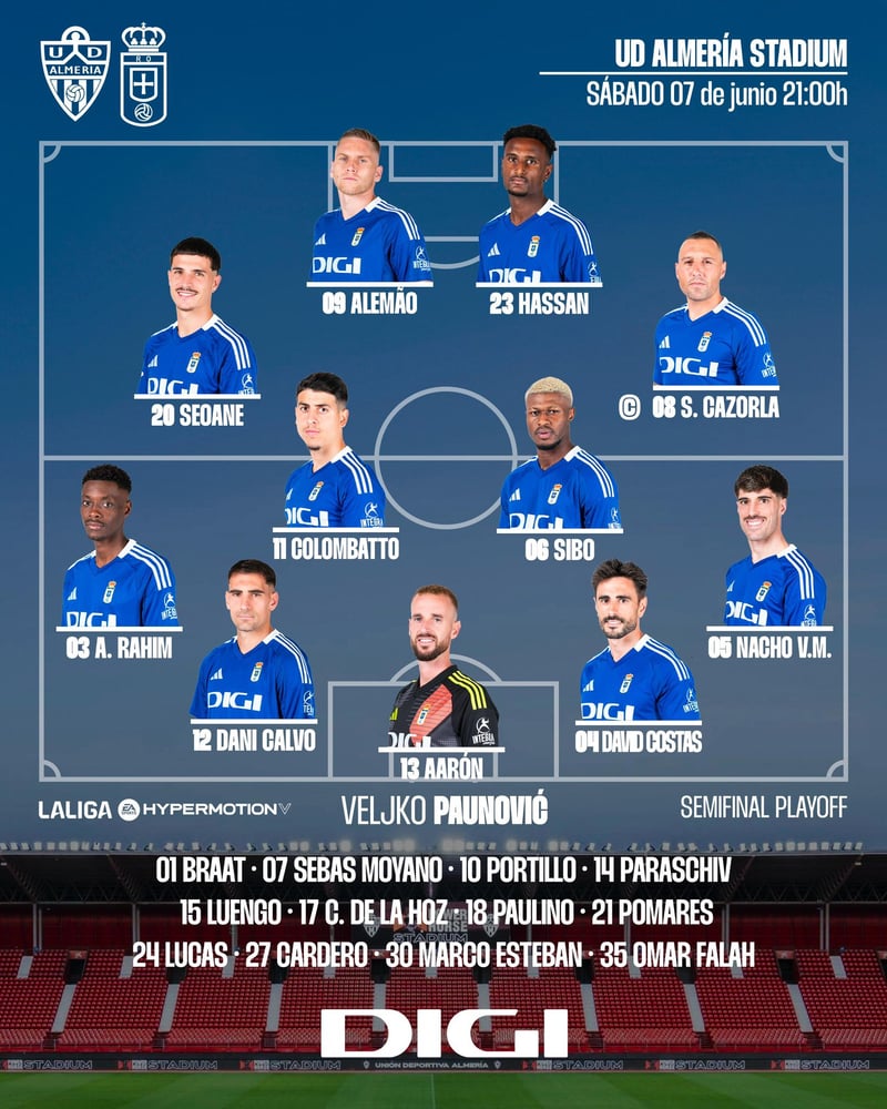Almería y Real Oviedo disputarán este sábado a partir de las 21:00 horas la ida de las semifinales del play off de ascenso a Primera desde LaLiga Hypermotion. El Almería, sexto clasificado de la Liga regular en LaLiga Hypermotion se las verá ante el Real Oviedo, tercero de la clasificación de Segunda división. El partido entre Almería y Real Oviedo tendrá un segundo acto la próxima semana pero de lo que ocurra entre andaluces y asturianos determinará el partido de vuelta en el Carlos Tartiere.